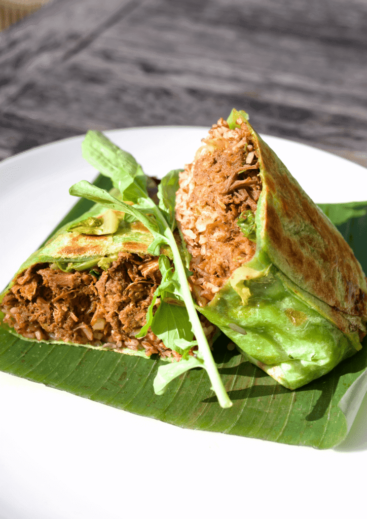 At Penida Colada beachfront restaurant, the Beef Rendang Burrito is rich, slow-cooked, and unapologetically satisfying.